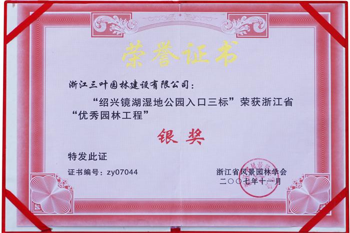 本工程作為整個鏡湖濕地公園入口標志性工程,總施工面積18000多平方米,包括喬灌木種植、崖壁覆綠、休閑廣場、水上木棧道、茶樓、照明系統、背景音響系統等,總造價850萬元。施工過程中,由于50天超短工期,為確保“五一”開園,公司抽調相關專業技術人員,在有關部門和相關專家的幫助和指導下,制定各專項施工方案,確保工程按時順利完成。施工中無質量、安全事故發生,完工后于2007年2月10日一次性通過驗收,達到優良等級。并在2007年度浙江省風景園林學會組織的全省優秀園林工程評選中獲得銀獎。