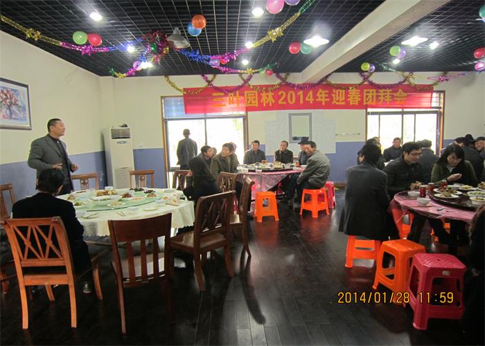 - 辭別2013,迎來2014。新年的鐘聲即將敲響,時光的車輪一軋而過,留下一道道深深的印痕。伴隨著冬日里溫暖的陽光,滿懷著喜悅的心情,大家在這個辭舊迎新的日子里,三葉園林公司舉辦一年一度的團拜會,公司行政、生產、工程、養護、苗圃基地管理人員在公司總部歡聚一堂,回憶三葉歷史,展望三葉未來。首先,由董事長金玉兔為大家致辭,給大家拜個早年,祝愿大家在新的一年里,身體健康,萬事如意,心想事成!再作了2013年度工作總結,他首先對公司全體員工表示感謝,沒有你們,就沒有公司的未來,接著,從公司在2013年取得的成就和存在不足,以及2014年度工作規劃,肯定了公司在2013年度取得的成績,深入剖析了公司在發展過程中,存在的問題與不足。正是源于對園林熱愛和執著,才讓大家有機會聚到一起,組成了三葉這個大家庭。接下來就是聚餐時間,在溫馨、和諧的氛圍中,大家一起舉杯,為了明天,干杯。