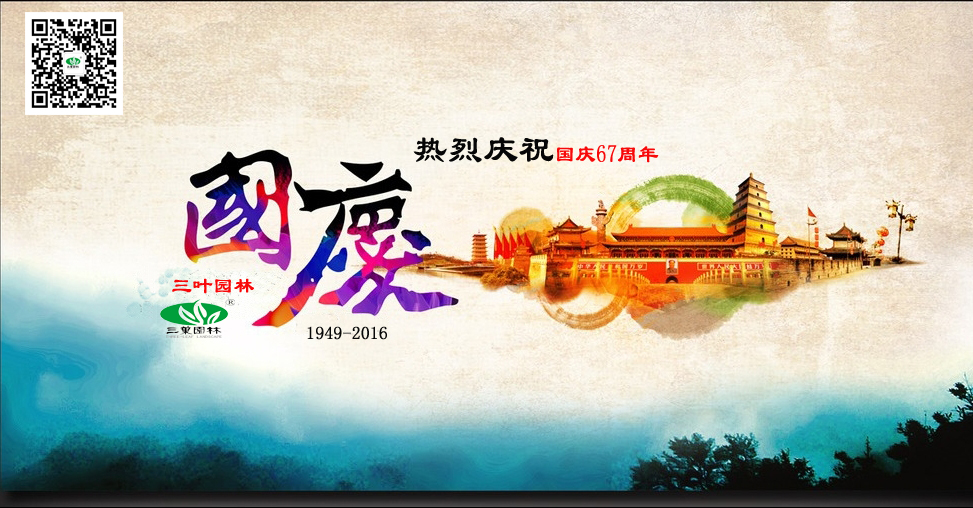 - 又是個金秋的十月,又是個裝滿收獲的季節。在這個花果飄香的季節里,我們迎來了祖國67歲的生日,在經歷走過來的數次磨礪后,祖國以其堅強不屈的脊梁高高屹立在世界的東方,在這里,要自豪地對祖國母親說:我愛你,中國!在這普天同慶的的日子里,浙江三葉園林建設有限公司董事長金玉兔、總經理王靈攜全體員工,向長期以來支持和關心企業發展的各級領導、合作伙伴、社會同仁,致以節日的問候和祝福。祝福大家:國慶節快樂。在這秋高氣爽、碩果累累的季節里,度過一個美好而又愉快的節日。我們堅信,在我們的不懈努力下,祖國的明天,天更藍、山更綠、水更清、經濟更繁榮、人民更幸福、國力更強盛,祖國的明天更美好。