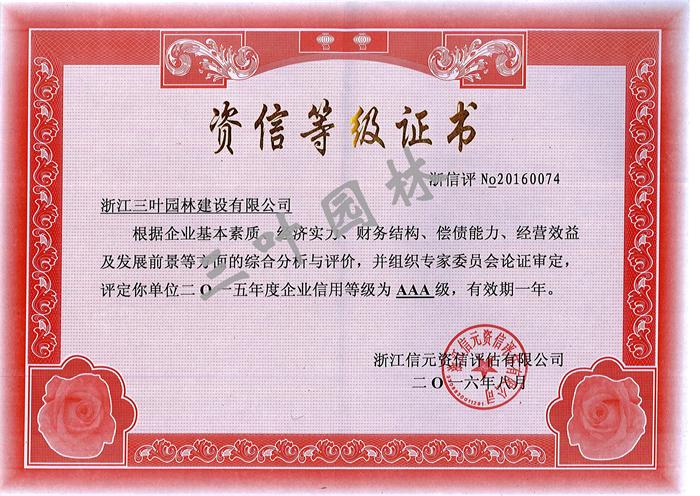近日,浙江三葉園林建設有限公司被授予“2016年AAA信用等級企業”榮譽稱號。從2003年首次獲得該榮譽至今,三葉園林已連續十三年獲評“AAA信用等級企業”,是連續獲得此項榮譽時間較長的企業。