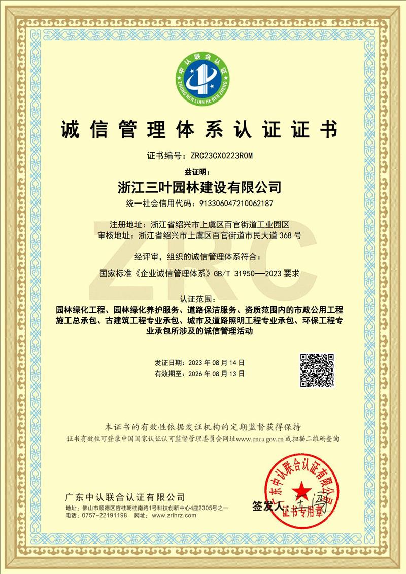 8月9日至11日,廣東中認聯合認證的專家一行1人蒞臨三葉園林進行現場復審認證。專家依據企業誠信管理體系文件、法律法規和技術標準、現場等相關要求,對公司一年來的誠信體系運行情況,全流程進行了細致審查。經過4天的認證復審,專家一致認為三葉園林誠信管理體系運行穩定有效、符合誠信管理體系標準,同時對進一步優化提升管理體系建設提出了寶貴建議。