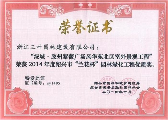 - 綠城膠州紫薇廣場風華苑工程獲2014年度紹興市"蘭花杯"園林綠化工程優質獎