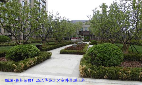綠城•膠州紫薇廣場風(fēng)華苑北區(qū)室外景觀工程:位于膠州市海口區(qū)的核心位置,是膠州市最核心的地段,地理位置優(yōu)越,北靠云溪河,南臨膠州市委市政府,緊鄰三里河公園和膠州市三大中心,即會展中心、文化中心和體育中心。該項目景觀工程總面積約23500㎡(含外圍)。其中,綠化面積約 16000㎡,土建面積7500㎡。綠化率達68%,建筑內(nèi)容為多層住宅,另有商鋪配套等。室外硬質(zhì)景觀工程包廊架、水景、花池、硬質(zhì)基礎(chǔ)、貼面等,軟景景觀工程包含場地整平、選苗號苗、喬灌木種植、草坪鋪設(shè)、養(yǎng)護管理等。植物配置: 主要選用植物品種有:山玉蘭、紫玉蘭、山杏、櫻花、海棠、紫薇、美國紅楓、紅葉李、石楠、冬青、杜鵑、八仙花、女貞等各種灌木為配景。地被植物為花葉絡(luò)石、常綠草坪等。做到常綠、落葉相結(jié)合;大喬、灌木本結(jié)合,鄉(xiāng)土樹種與外引品種相結(jié)合,整個小區(qū)植物配置自然,層次豐富、提升綠地的景觀效果。