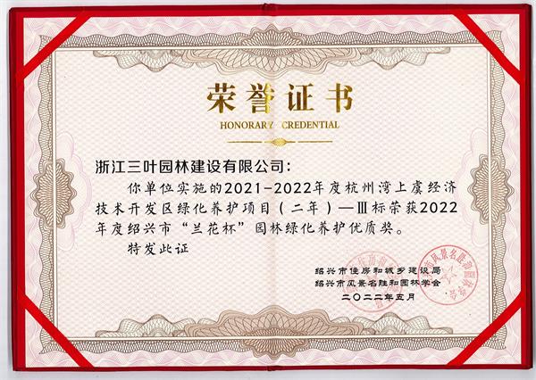 • 2021-2022年度杭州灣上虞經(jīng)濟技術開發(fā)區(qū)綠化養(yǎng)護項目(二年)—Ⅲ標喜獲紹興市蘭花杯